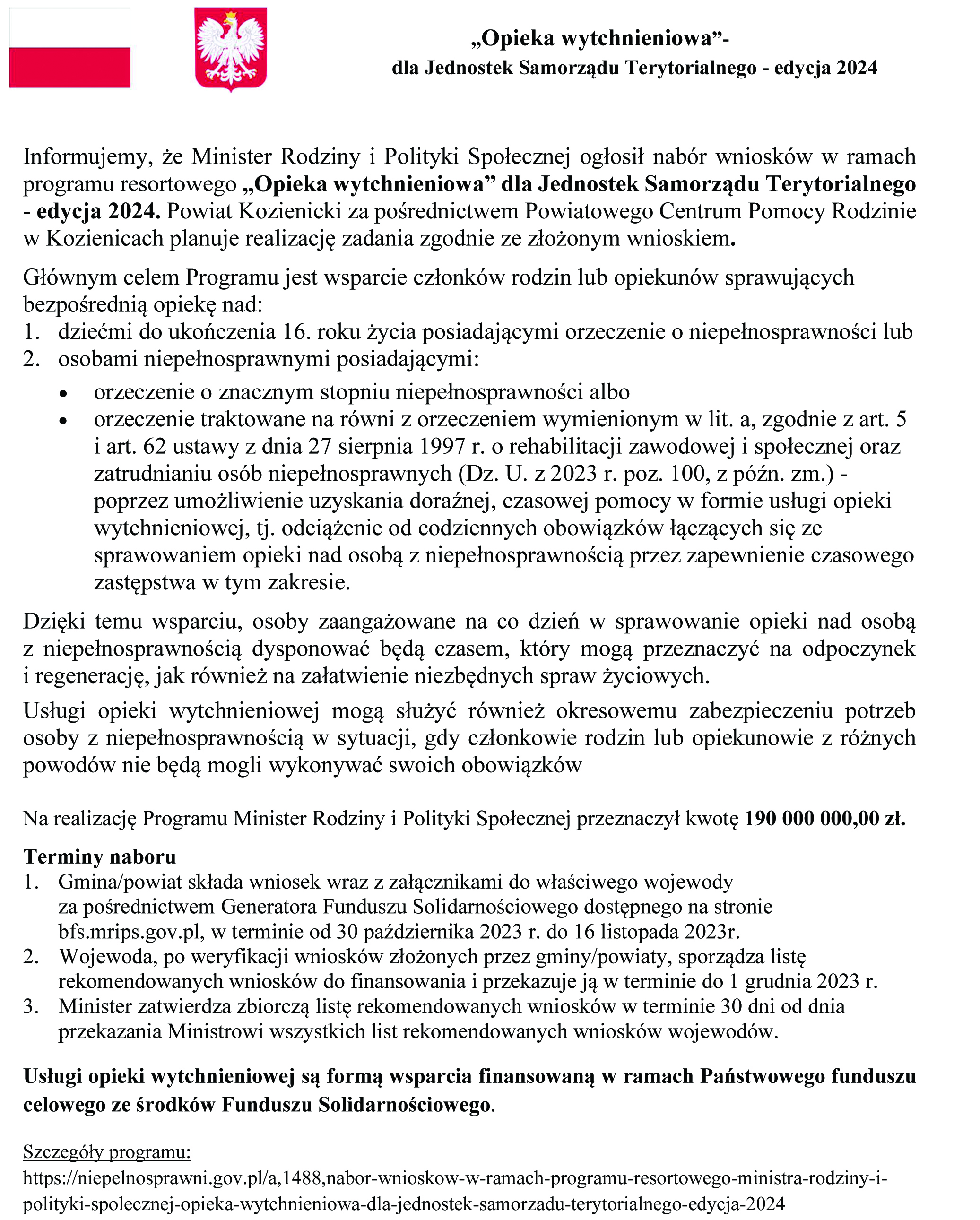 Informujemy, że Minister Rodziny i Polityki Społecznej ogłosił nabór wniosków w ramach programu resortowego „Opieka wytchnieniowa” dla Jednostek Samorządu Terytorialnego — edycja 2024. Powiat Kozienicki za pośrednictwem Powiatowego Centrum Pomocy Rodzinie w Kozienicach planuje realizację zadania zgodnie ze złożonym wnioskiem.